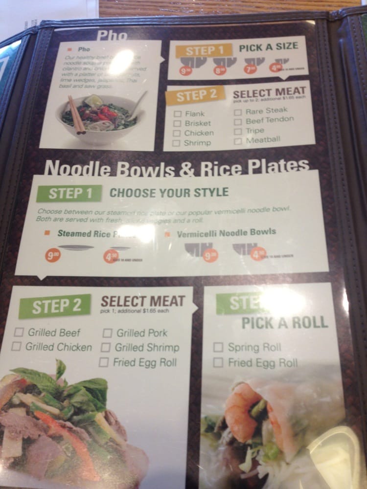 Includes noodles and one choice of meat Rare steak, Brisket, Tendon, Tripe, Meatballs, Chicken or Shrimp Excludes green, white onions cilantro unless otherwise specified