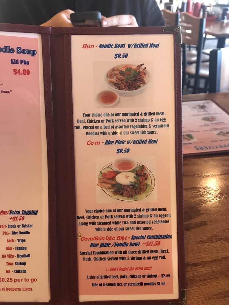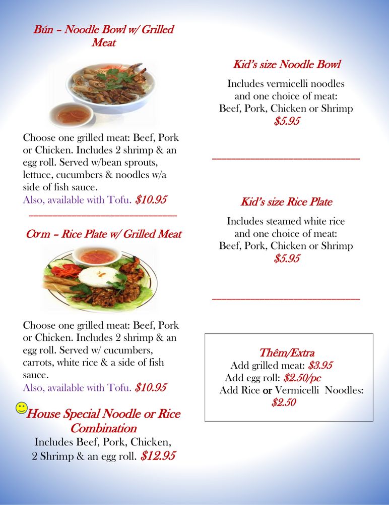 Choose one grilled meat Beef, Pork or Chicken. Includes 2 shrimp an egg roll. Served w cucumbers, carrots, white rice a side of fish sauce. Also, available with Tofu.