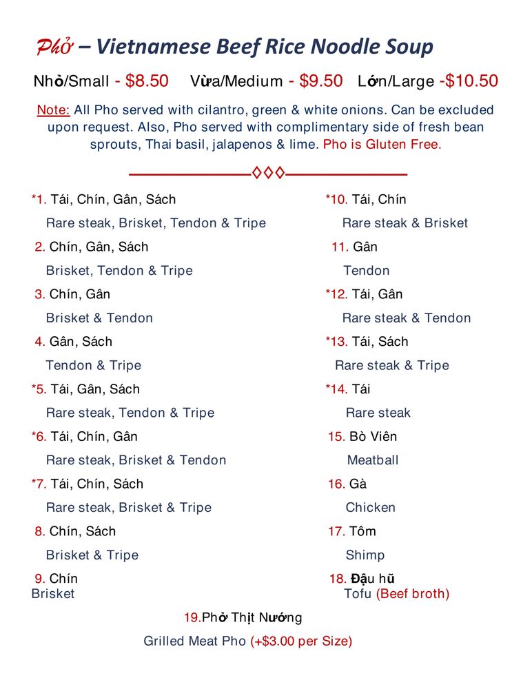 All Pho served with cilantro, green white onions. Can be excluded upon request. Also, Pho served with complimentary side of fresh bean sprouts, Thai basil, jalapenos lime. Pho is Gluten Free.